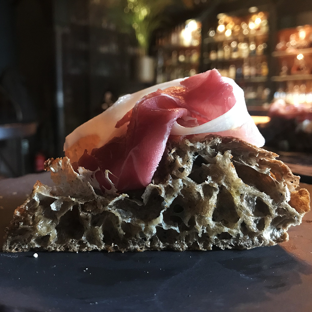 barley dough, fresh tomato & pickled capers, San Daniele prosciutto crudo, parmesan foam, olive oil