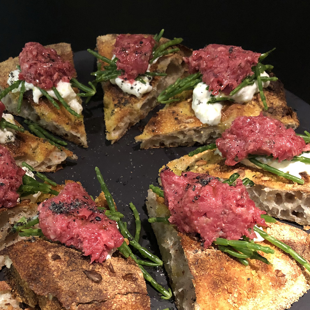 corn dough with sunflower seeds, burrata dop, sea asparagus, wagyu tartare (150g), black sesame salt, olive oil